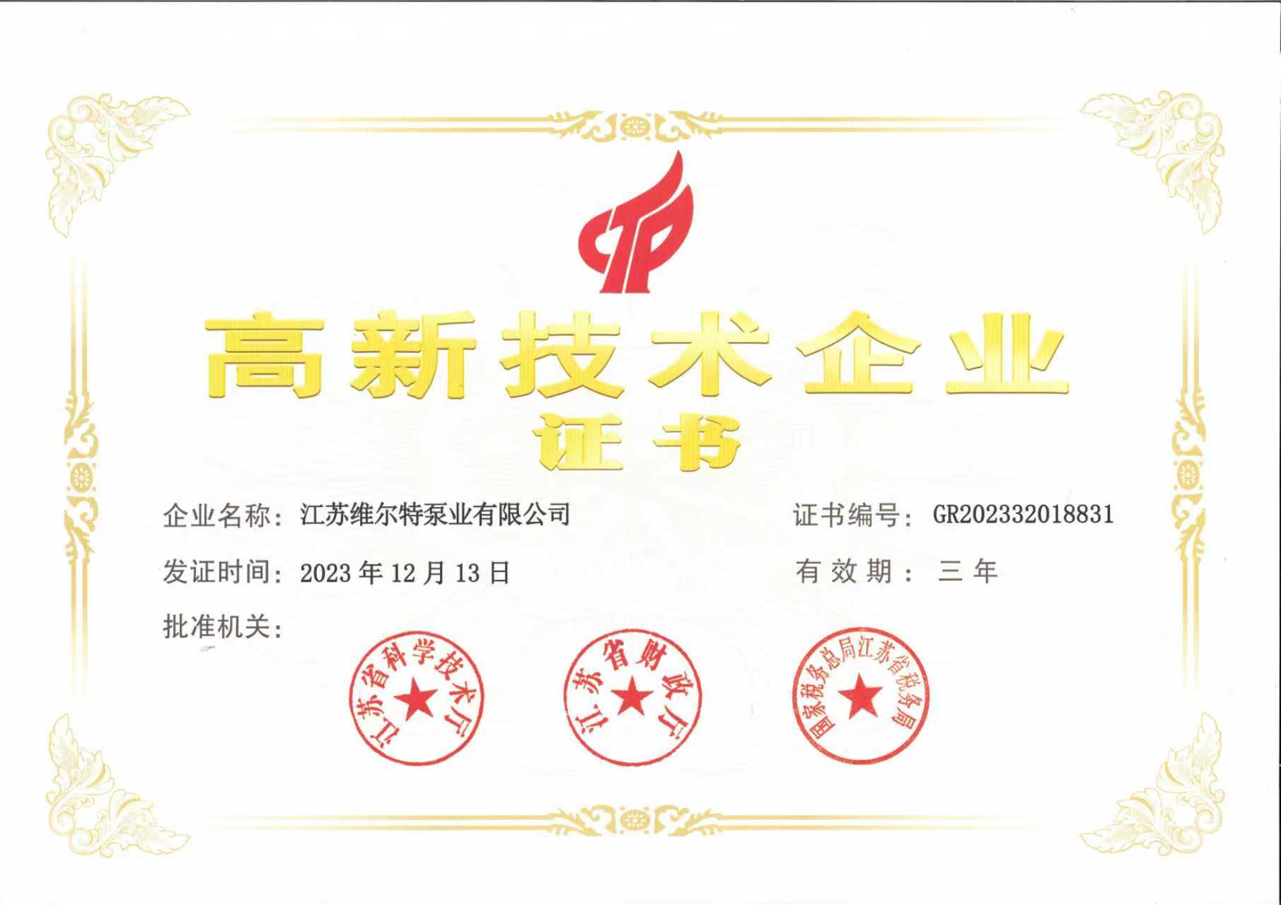 高新技术企业证书